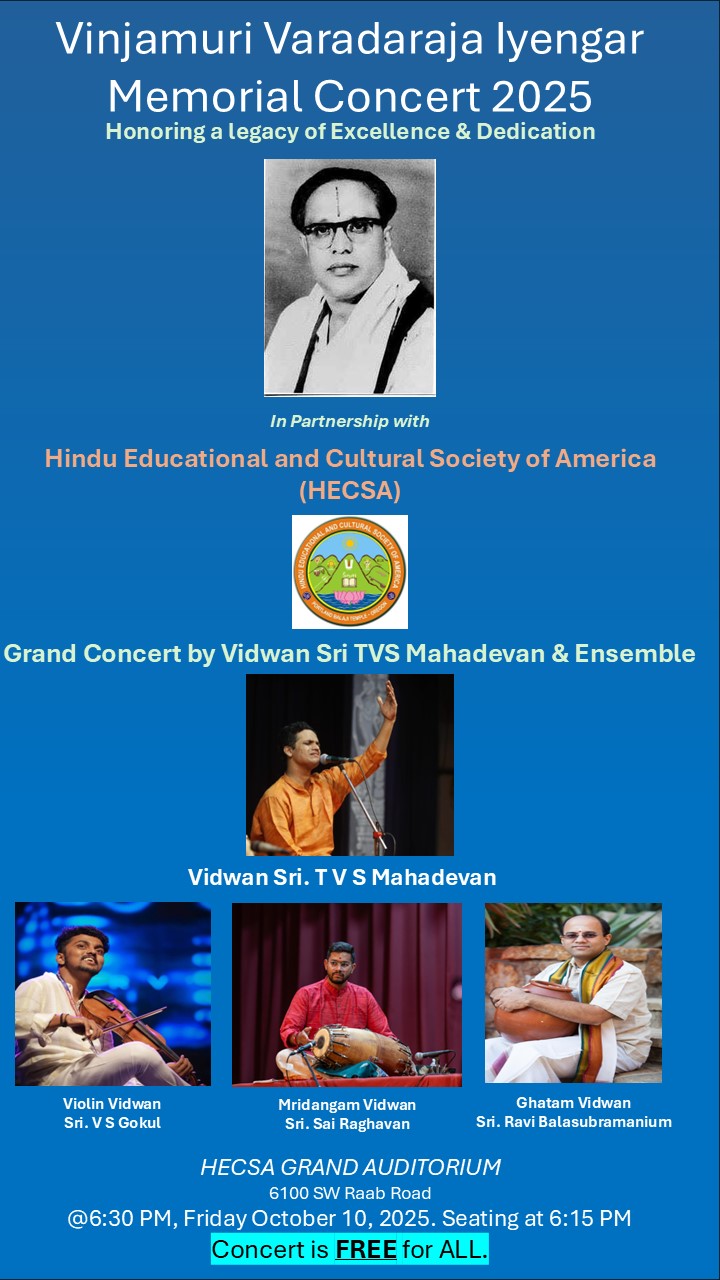 He will be accompanied by distinguished artists Vid. Trichy B. Harikumar on Mrudangam and Vid. Trichy S. Krishnaswamy on Ghatam.